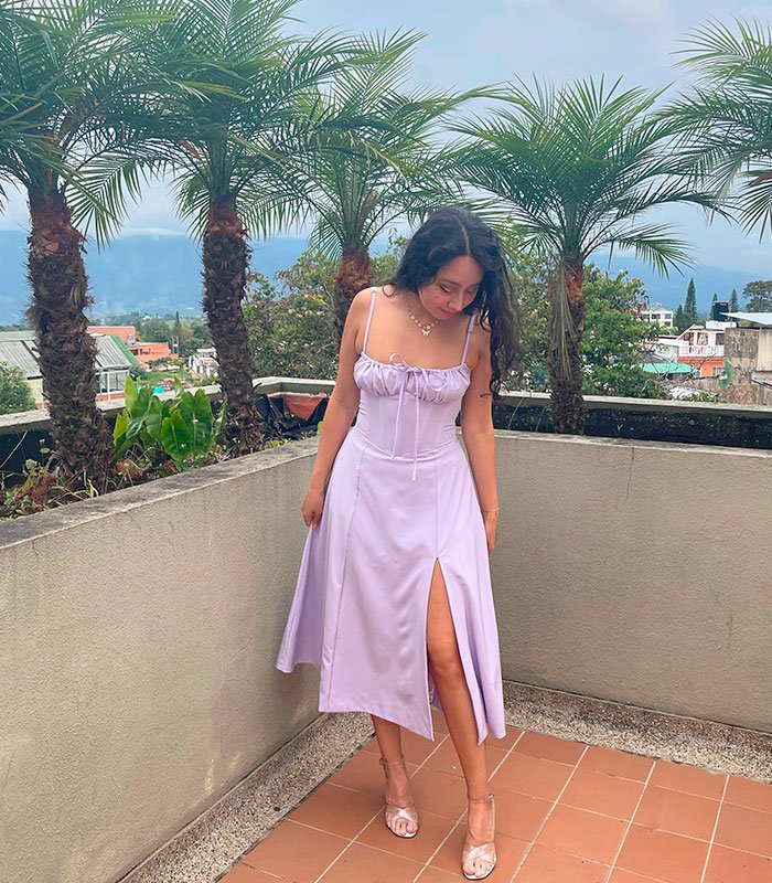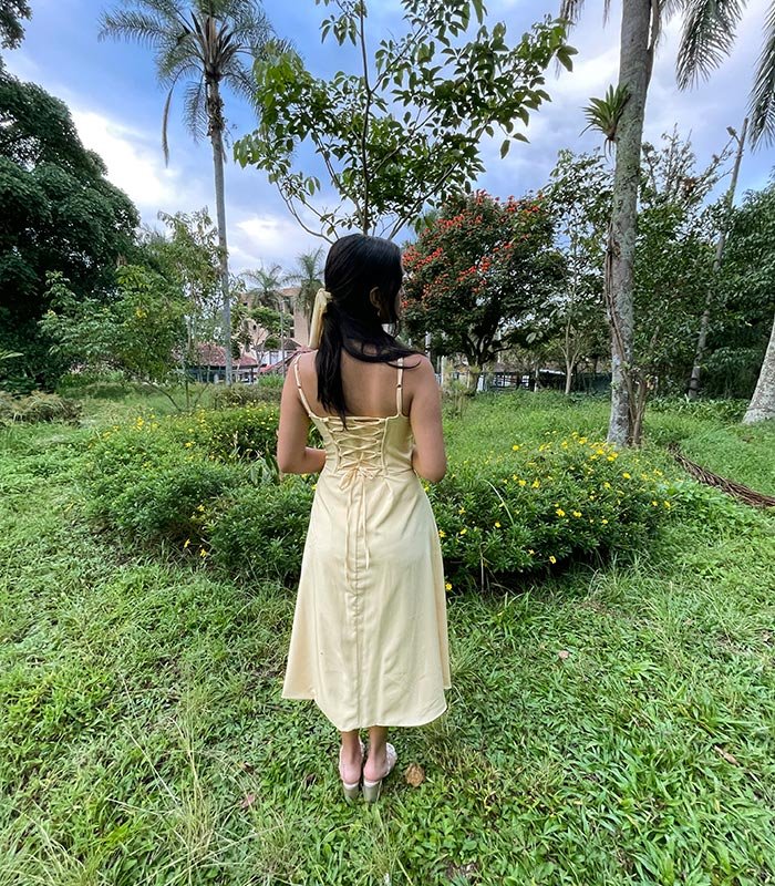 Vestido midi, con detalle de tirantes de ajustar en busto, es tipo corse en torso por lo que lleva varillas en la parte de abdomen y espalda, usamos unas varillas especiales que hacen un ajuste lindo al cuerpo pero sin que te sientas incomoda con él, su material es suave y vaporoso pero no debes preocuparte porque se te vaya a ver nada porque tu vestido no transparenta nada