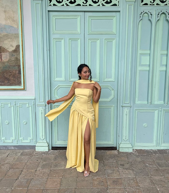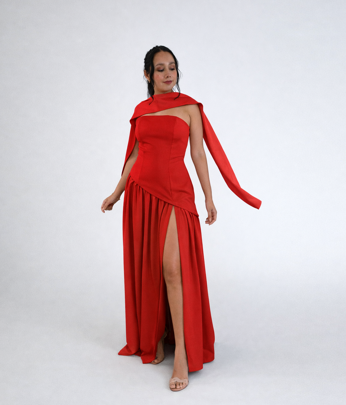 Vestido strapless con espalda tipo corse y faldon recogido en seda, te sentiras como una diosa griega cuando lo uses con sus detalles asimetricos y su pashmina resaltarás en donde lo uses