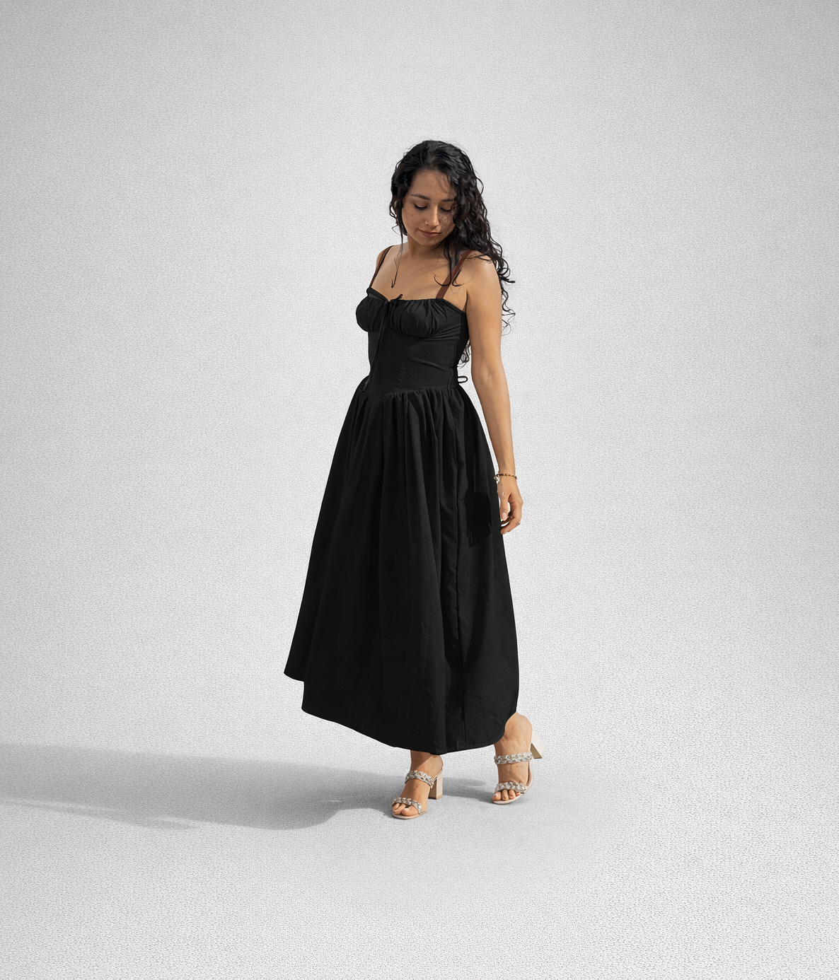 Vestido con detalle de tiras de ajustar en busto y tirantes de 2cm de ancho, es tipo corset en torso por lo que lleva varillas en la parte de abdomen y espalda, usamos unas varillas especiales que hacen un ajuste lindo al cuerpo pero sin que te sientas incomoda con él, el recogido y vuelo en la parte de la falda lo hacen un vestido super femenino y elegante, y como detalle final que todas amamos, trae bolsillos laterales